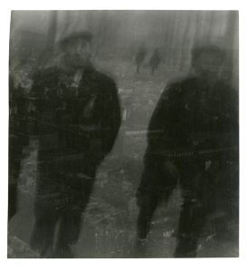 bande de papier collée au dos et numéro 2 sur le montage sous l'épreuve. Feuille de papier calque de protection, du temps Provenance : Collection Florent Fels Collection André Jammes Commerce d'art parisien Littérature : Morand. La route de Paris à la Méditerranée, reproduction Collectif. Photographie Bauhaus 1 91 9-1 933, reproduction page 77 (un autre cadrage, dans le rapport du film 24x36) [Workers-Early Morning 1931] Notes : Florent Fels (1891-1977), critique d'art, journaliste, écrivain, éditeur, publia Germaine Krull dans sa revue l'Art Vivant. Il accompagna ses images de préface (Métal) et de textes (1 00 X Paris). A l'occasion de l'édition du livre de Paul Morand, il eut l'idée d'ajouter aux photographies de Krull des images d'autres auteurs, dont celle-ci de Moï-Ver Des photographies de Krull pour La route de Paris à la Méditerranée se trouvaient autrefois dans la collection Jammes (Vente Jammes II, 21 mars 2002) provenant de l'éditeur Firmin-Didot