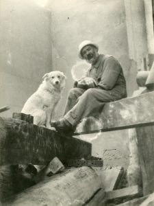 Constantin Brancusi (Hobita 1876-Paris 1957) Autoportrait avec sa chienne Polaire dans l'atelier Vers 1921 Épreuve argentique 23,9 x 18 cm Dédicace manuscrite de son écriture tremblante sur l'épreuve Provenance : Collection Guitou Knoop...