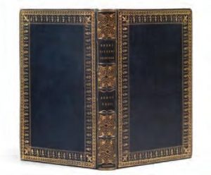 aux palmettes sertie de double filets, fleuron en angle, l’ensemble doré, dos lisses ornés de résilles d’annelets entrelacés, doublures et gardes de tabis jonquille, gardes de vélin ivoire, roulette intérieure dorée, tranches dorées (Rel. P. Bozerian). édition - « la seule complète » - du livre le plus populaire de l’humaniste et imprimeur Henri estienne (1528-1598). Henri estienne est le fils de robert estienne (1503-1559), l’imprimeur de François Ier. Philologue, on lui doit le fameux Thesaurus Græcae Linguae, paru en 1572, et de très nombreuses traductions des auteurs anciens. Mais il fut aussi un ardent défenseur de la langue française contre la prédominance du latin et l’invasion des italianismes, dont le Traité de la conformité du langage françois avec le grec, qui fut publié en 1569. Dans son Apologie pour Hérodote, estienne tente de réhabiliter le sérieux et la crédibilité de l’historien d’Halicarnasse. Mais, prenant prétexte du texte de l’auteur de L’Histoire, il y fait aussi œuvre de satiriste, mêlant à profusion et au gré de ses humeurs des anecdotes, parfois « cyniques et amères », sur son siècle, et n’hésitant pas, en particulier, à porter de virulentes attaques contre le catholicisme et les gens d’église, dont sa famille, partisane de la réforme, eut à subir les menées. L’auteur fut blâmé par le conseil de Genève pour son texte et contraint de modifier certains passages. Malgré cela, la tradition veut que ce livre, qui peut être considéré comme un chef-d’œuvre de la littérature satirique du XVIe siècle, ait valu à son auteur d’être brûlé en effigie à Paris, sur la place de Grève. S’y trouve l’une des premières critiques des œuvres de rabelais. Montaigne fait un long emprunt à cet ouvrage dans le livre I des Essais. 3 frontispices allégoriques gravés, non signés, dénonçant les errements du XVIe siècle. exemplaire relié par Jean-claude Bozerian pour le libraire et érudit antoine-augustin renouard (1765-1853). ce dernier consacra aux estienne une importante étude. Y traitant de ce texte, il écrit notamment que cette édition de 1735 en est « la seule complète », qui recueille « diligemment » les « passages et toutes les différences des douze à quinze éditions anciennes de cet ouvrage ». Les volumes comportent les gardes de vélin ivoire qui caractérisent en partie les livres de ce collectionneur. Dimensions : 159 x 96 mm.