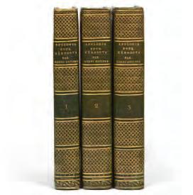 orné d’une palmette dorée plusieurs fois répétée, roulette dorée intérieure, non rogné (Relié par Antne Chaumont, Relieur de l’Institut de France). Provenances : antoine-augustin renouard (Cat., 20 nov. 1854 et jours suivants, n°2279), avec son ex-libris ; J. Debonne, avec son ex-libris, sa signature manuscrite et une mention précisant qu’il acquit l’ouvrage à la « vente renouard à Paris 1854 » ; Laurent Veydt, à Bruxelles, avec son timbre sec. Expositions : culot (P.), Relieurs et reliures décorées en France aux époques Directoire et Empire, Bibliotheca Wittockiana, 16 sept. 2000-10 févr. 2001, Bruxelles, n°117, avec reproduction ; […],Une vie, une collection, Bibliotheca Wittockiana, 10 oct. 2008-28 févr. 2009, éditions Faton, 2008, pp. 70-71 (notice sur renouard, avec reproduction). cohen, I, 364 ; Schreiber (F.), The Estiennes, Hanes Foundation, 1982, pp. 145-146, «Henri estienne’s most popular book» ; renouard (a.-a.), annales de l’imprimerie des Estienne, New York, Burt Franklin, 1972, pp. 126-128 ; renouard (a.-a.), Catalogue de la bibliothèque d’un amateur…, III, renouard, 1819, p. 255, « 3 vol. in-8. mar. vert. moire, dent. » ; culot (P.), Jean-Claude Bozerian, un moment de l’ornement dans la reliure en France, motifs n°9 et 34 (pl. I et IV), 2, 6 et 14 (pl. X). Le comédien Deslauriers,surnommé Bruscambille,exerça à l’Hôtel de Bourgogne,l’un des principaux lieux de représentations théâtrales du XVIIe siècle. Il était fameux pour les propos souvent paradoxaux, inintelligibles ou dénués de sens dont il ponctuait les discours d’ouverture et de clôture du théâtre, comme il était d’usage alors. Les Pensées facecieuses sont l’un des deux recueils, avec Les Œuvres de Bruscambille, dans lesquels ces bouffonneries furent rassemblées. exemplaire aux armes du bibliophile anglais ralph Sneyd (1793-1870), dans une reliure exécutée par antoine chaumont, avec son étiquette à l’adresse de la rue du Foin-Saint-Jacques, n°18. après avoir émigré à Londres pendant la révolution, antoine chaumont revint à Paris, où il exerça approximativement entre 1798 et 1821. relié sur brochure, l’exemplaire répond aux critères du goût anglo-saxon de la bibliophilie qui privilégie la condition originelle. ainsi, il n’a été ni lavé, ni pressé.