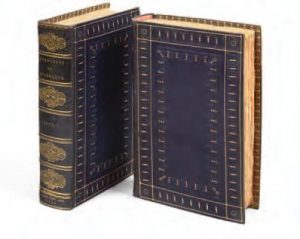 édition imprimée par les Didot, établie sur le texte de l’originale publiée en 1601. Œuvre majeure de Pierre charron (1541-1603), elle parut deux ans avant sa mort, prolongeant les Essais de Montaigne dont il était le disciple et l’ami. Désavouée par les théologiens de la Sorbonne dès sa parution malgré le soutien de l’évêque de Boulogne, claude Dormoy, De la sagesse présente un catholicisme orthodoxe et défend la tolérance religieuse. La séparation qui y est faite entre la religon et la morale fit accuser son auteur d’athéisme. ce traité de philosophie morale est consacré dans sa première partie à la connaissance de soi, tandis que la deuxième livre les règles générales de la sagesse ; la dernière porte sur les quatre vertus morales à acquérir et à conserver : la prudence, la justice, la force et la tempérance. L’un des rares exemplaires sur PeaU De VéLIN, il fut relié par Thouvenin à la demande de charles Nodier (1780-1844). D’après Van Praet, ce tirage confidentiel serait connu à trois exemplaires, ceux de Didot père, aujourd’hui à la BN, et de l’éditeur Barrois l’aîné, le troisième ayant appartenu à chardin. L’exemplaire Nodier ne peut être identifié à l’un de ceux-là qui sont décrits comme étant en deux volumes. Il vient donc compléter cette liste restreinte. Mors restaurés. Plat supérieur du tome III épidermé. Dimensions : 176 x 102 mm. Provenances : Nodier (Cat., 1830, n°114) ; Jérome Bignon (Cat., 1849, n°437). Tchemerzine, II, p. 264 (édition décrite en deux volumes) ; Van Praet, III, p. 33, n°44 ; […], Une vie, une collection, Cinq siècles d’art et d’histoire à travers le livre et sa reliure, 10 octobre 2008-28 février 2009, pp. 78-79 (longue notice sur charles Nodier) ; Devauchelle (r.), Joseph Thouvenin et la reliure romantique, Blaizot, 1987, pp. 137-140 et 152-157 ; culot (P.), Relieurs et reliures décorées en France à l’époque romantique, Bibliotheca Wittockiana, 1995, pp. 562 (notice sur Joseph Thouvenin).