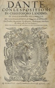 Dante - con l’espositioni di Christoforo Landino, et d’Alessan-dro Vellutello. Sopra la sua Comedia dell’Inferno, del Purgatorio, & del Paradiso. Con Tavole, Argomenti, & Allegorie, & riformato, riveduto, & ridotto alla sua vera Lettura, per...