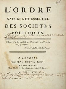 [Le Mercier De La Rivière, Paul-Pierre] - L’Ordre Naturel et Essentiel des Sociétés Politiques. Londres, Jean Nourse, se trouve à Paris, Desaint, 1767. In-4, (1) f., Vii, 511 pp., qqs. rouss., veau brun marbré de l’ép., dos à nerfs orné,...