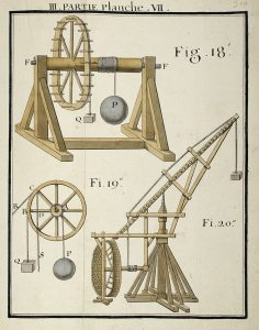 marge ex. de qqs. pl. abîmée avec manque de papier, vélin vert us. de l'ép., sans dos, manques aux plats. Deux planches h. t. aquarellées représentent le plan d'un mou-lin et l'autre l'élévation de deux tournants d'un moulin.