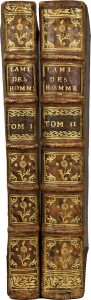 Mirabeau, Marquis de] - L’Ami des Hommes. Avignon, 1756-1758. 4 parties en 2 vol. in-4, Vi, 156 pp., (1) f. ; 218 pp. (1) f. ; 158 pp., (2) ff. ; (4) ff., 278, 81 pp., qqs. taches claires en marge du tome I, veau fauve marb. de l’ép., dos à...