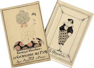 Barbier, George - La Guirlande des mois. Cinquième année, 1921. Paris, Meynial, 1921. In-16, titre avec vignette ill. en coul., (1) f., 137 pp., 6 fig. h. t. coloriées au pochoir, rel. éd. en soie avec plat ill. au ballon, jaquette et étui ill.,...