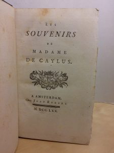 CAYLUS (Marthe-Marguerite Le Valois de Villette de Murcay). Les Souvenirs de Madame de Caylus. Amsterdam [Genève], Jean Robert, 1770 ; in-8, bradel percaline vert sombre, pièce de titre marron et fleuron doré au dos, tête rognée, [Petitot rel.]....