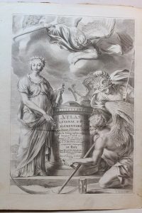accrocs, premier plat détaché. Titre, 7 planches à double page aquarellées et 46 cartes à double page (sauf 2) rehaussées à l'aquarelle, le tout gravé sur cuivre. L'atlas mondial se poursuit par un Atlas de France : titre gravé à double page et cartes à double page rehaussées à l'aquarelle. On a ajouté en fin d'ouvrage une grande carte repliée du monde dressée par N. Bellin, gravée sur cuivre et rehaussée à l'aquarelle. Le texte imprimé est collé de part et d'autre des cartes, dans les marges. Quelques petites déchirures marginales, mais intérieur frais par ailleurs