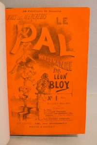 BLOY (Léon). Le Pal, hebdomadaire. Paris, Penin et Soirat, 1885 ; 4 numéros en un vol. in-12, demi-chagrin bleu nuit, liseré doré, dos à nerfs. Collection complète des quatre numéros, avec leurs couvertures oranges, parus du 4 mars au 2 avril...