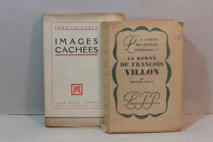 l'auteur signé F. Carco à Léon Pierre Quint : « en amitié fervente et fidèle. »— JOINT, du même :Images cachées. Paris, Albin Michel, 1929 ; in-8, broché, entièrement non coupé.Édition originale. L'un des 50 exemplaires du tirage de tête sur papier vergé de Hollande. Bon exemplaire, malgré des ma&rges un peu brunies