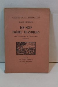 CENDRARS (Blaise). Dix-neuf poèmes élastiques. Paris, Au Sans Pareil, 1919 ; pet. in-8, broché, entièrement non coupé. Édition originale. Portrait de l'auteur par Modigliani en frontispice. L'un des exemplaires numérotés sur papier vélin...