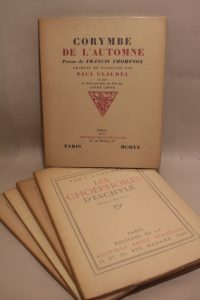vélin pur fil Lafuma-Navarre.— JOINTS, du même : - L'ours et la lune, farce pour un théatre de marionnettes. Paris, Éditions de la nouvelle revue française, 1919 ; gr. in-8 broché. - Trois poèmes de guerre. Paris, éditions de la Nouvelle Revue Française, 1915 ; gr. in-8, broché. Édition originale. - Les Eumenides d'Eschyle. Paris, NRF, Gallimard, 1920 ; gr. in-8, broché. Mention de quatrième édition. - Les Choéphores d'Eschyle. Paris, NRF, Gallimard, 1920 ; gr. in-8, broché. Édition originale. L'un des 800 exemplaires numérotés réservés "aux amis de l'édition originale" sur papier vélin pur fil Lafuma de Voiron