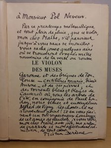 DERÈME (Tristan). Le Violon des muses. Paris, Grasset, 1935 ; in-8, broché, non coupé, chemise et étui demi-chagrin marron, dos à nerfs. Édition originale. L'un des 8 exemplaires numérotés du tirage de tête sur papier du Japon, portant un...