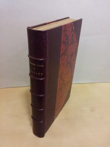 demi-maroquin aubergine à coins, dos à nerfs, tête dorée, non rogné, couvertures conservées, [Huser], couv. passées. Édition originale. Premier ouvrage de Loti, paru sans nom d'auteur. À la fin est relié un catalogue de 36 pages des éditions Calmann Lévy, daté de mai 1878. Superbe exemplaire, parfaitement établi par Huser. Vicaire, V, 401-402