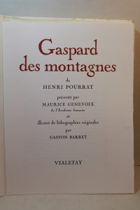 POURRAT (Henri). Gaspard des montagnes. Paris, Vialetay, 1967 ; pet. in-folio, en ff., couverture illustrée rempliée, chemise et étui. Orné de 24 lithogaphies originales de Gaston Barret, dont la couverture. Présenté par Maurice Genevoix. L'un...
