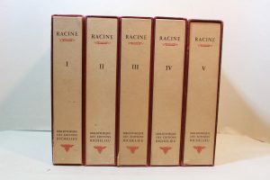 RACINE (Jean). Théâtre de Racine. Paris, Bibliothèque des éditions Richelieu, 1951 ; 5 vol. in-8, brochés, chemise et étuis. Bois de Valentin Le Campion. L'un des 500 exemplaires numérotés sur papier chiffon filigrané Lafuma