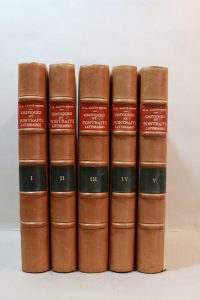 SAINTE-BEUVE (Charles-Augustin). Critiques et portraits littéraires. Paris, Eugène Renduel, 1836-1839 ; 5 vol. in-8, demi-basane fauve à coins, dos à nerfs, pièces de titre brique et de tomaison vertes, tranches rouges, [Rel. moderne]. Édition...