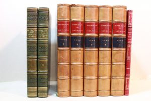 à froid et de filets dorés, ébarbé, [Rel. de l'époque]. Édition originale du premier livre de l'auteur.Le second volume, entièrement consacré à Ronsard, contient la réimpression d'œuvres choisies qui n'avaient pas été publiées depuis 1630. Très légères rousseurs, mouillure claire aux trois derniers ff. Bel exemplaire en reliure de l'époque.— JOINT, du même :Port-Royal. Deuxième édition. Paris, L. Hachette et Cie, 1860 ; 5 vol. in-8, demi-veau chamois, liseré doré, dos à nerfs, pièces de titre rouge et de tomaison bleu nuit, tranches peignées, [Rel. de l'époque].Bien complet du plan de l'Abbaye de Port-Royal des champs au tome V. Frottements aux coiffes supérieures.On joint la Table alphabétique et analytique des noms propres de personnes^ (Paris, L. Hachette et Cie, 1861 ; demi-chagrin rouge, dos à nerfs orné) de 88 p