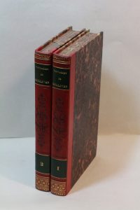 et de motifs dorés, pièces de titre et de tomaison vert Empire, tranches cailloutées, étuis bordés de chagrin violine, [Rel. de l'époque]. Premier tirage des illustrations de Grandville : frontispice tiré sur papier de Chine volant et nombreuses figures gravées sur bois dans le texte, certaines à pleine page. « Cette illustration occupe l'un des premiers rangs dans l'oeuvre de Grandville » (Brivois) ; « Ce très beau romantique illustré est d'une grande rareté en belle condition » (Carteret). Ex-libris non identifié. Très bel exemplaire, bien frais, dans une fine reliure de l'époque. Très petite trace de coup en pied d'un plat. Brivois, 387. Carteret III, 578. Vicaire, VIII, 718