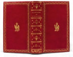 l’ensemble frappé à l’or, dos lisse orné d’un décor allégorique au cheval ailé et à la maternité, tranches dorées (Relié P. Doll). Provenance : Marie-Louise, impératrice des Français. Expositions : culot (P.), Relieurs et reliures décorées en France aux époques Directoire et Empire, Bibliotheca Wittockiana, 16 sept. 2000-10 févr. 2001, Bruxelles, n°115, avec reproduction ; […],Une vie, une collection, Bibliotheca Wittockiana, 10 oct. 2008-28 févr. 2009, éditions Faton, 2008, pp. 58, n°45 (notice sur Marie-Louise, avec reproduction). Monglond, IX, 1096-1097 (« l’édition originale est de format in-12, la seconde, in-18 ») ; Tulard (J.), Dictionnaire Napoléon, Fayard, 1989, p. 551 ; olivier, 2654 (chiffre non décrit) ; culot (P.), Jean-Claude Bozerian, un moment de l’ornement dans la reliure en France, motifs n°9 et 33 (pl. I et IV) ; […], Die Bibliothek Napoleons I. und der Kaiserin Marie Louise, 1931, n°92. L’un des best-sellers de l’empire ; avec plus de quarante éditions il offrit aux relieurs du temps de rivaliser d’inventions stylistiques. 3 figures d’après Moreau le Jeune et Guérin, interprétées sur cuivre par Simonet et de Ghendt, et un bois gravé. Très fraîche reliure en vélin à décor allégorique, exécutée par F. Doll. Son vocabulaire ornemental (chouette, cheval ailé, maternité) rappelle la thématique de l’œuvre de Legouvé.