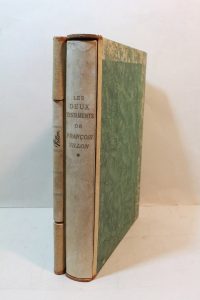 VILLON (François). Les Deux testaments. Paris, Club bibliophile de France, 1942 ; in-4 carré, bradel emi-parchemin à coins, titre doré au dos, tête dorée et pet. in-14, reliure hollandaise en parchemin, date imprimée sur le premier plat, nom...