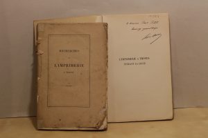 CORRARD DE BREBAN (Antoine-Henri-François). Recherches sur l'établissement et l'exercice de l'imprimerie à Troyes, contenant la nomenclature des imprimeurs de cette ville [^]. Troyes, Paris, Bouquot, Delion, 1851 ; in-8, broché. Rare seconde...