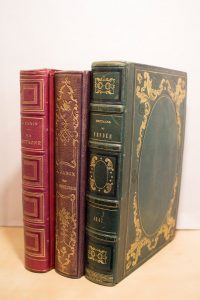 titre-frontispice, des 22 planches et 2 cartes gravés sur acier et des figures dans le texte gravées sur bois. Cet exemplaire a été enrichi de 6 planches de costumes gravées sur bois et aquarellées et de 2 planches d'armoiries chromolithographiées, provenant de la seconde édition. Bel exemplaire en reliure de l'époque, avec la couverture conservée (à la date de 1844).Vicaire, IV, 539. Carteret, III, 320.— JOINTS, même format :- JANIN (Jules). La Bretagne. Paris, Ernest Bourdin, 1844 ; demi-chagrin rouge, dos à nerfs orné d'encadrements dorés et à froid, tranches dorées, [Rel. de l'époque].Édition originale et premier tirage des figures : titrre-frontispice, 19 figures hors texte gravées sur acier, 4 planches de blasons chromolithographiées, 8 planches de costumes en couleurs, une carte gravée sur acier rehaussée à l'aquarelle et de nombreuses figures dans le texte gravées sur bois.Vicaire, IV, 541. Carteret, III, 321.- PITRE-CHEVALIER (Pierre-Michel-François Chevalier, dit). Bretagne et Vendée. Histoire de la Révolution française dans l'Ouest. Paris, W. Coquebert, [1845] ; chagrin vert Empire, sur les plats vaste décor doré et à froid dans les angles, large médaillon central ovale doré et à froid, dos à nerfs larges orné de motifs dorés et encadrements à froid, tranches dorées, encadrement intérieur d'un filet doré et à froid, [Ducroux].Premier tirage : 33 planches hors texte gravées sur acier et sur bois, 7 planches d'armoiries chromolithographiées et nombreuses figures dans le texte gravées sur bois.Coins légèrement émoussés, sinon bon exemplaire.« Ces livres documentaires : Normandie et Bretagne, forment une réunion assez rare en premier tirage » (Carteret).