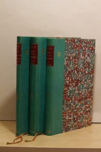 Cantiques imprimés à Troyes depuis le XVIIe siècle jusqu'à nos jours, avec des notes bibliographiques et biographiques sur les imprimeurs troyens, ouvrage orné de vingt gravures originales, avec la musique de plusieurs airs. Paris, Aubry, 1863, 1864, 1865 ; ens. 3 vol. in-8, demi-vélin vert, monogramme PP doré sur les plats et les dos, pièces de titres rouges, entièrement non rognés, couvertures, [Rel. de l'époque]. Édition originale pour chacun de ces trois ouvrages. Chacun un des 200 (192 pour le 3e) exemplaires numérotés sur papier vergé de Hollande. Très belle réunion en reliures uniformes de ces rares ouvrages consacrés aux livres liturgiques et populaires troyens, comportant une importante iconographie exécutée à partir des bois originaux des XVe et XVIe siècles