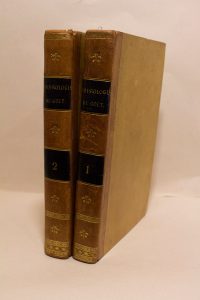 Gastronomes parisiens par un professeur, membre de plusieurs sociétés littéraires et savantes. Paris, A. Sautelet et Cie, 1826 ; 2 vol. in-8, demi-basane fauve, dos lisses ornés de motifs dorés, pièces de titre et de tomaison noires, tranches jaunes, [Rel. de l'époque], qq. rouss.. 1) [4] ff., p. [vii] à xiv, p. [5] à 390.- 2) 442 p. Édition originale, rare. Exemplaire du premier tirage (avec le E de Bourse au bas du titre du tome I, placé à l'horizontale. Cet ouvrage, le plus beau fleuron de la littérature gastronomique française, a été imprimé aux frais de l'auteur à 500 exemplaires seulement et mis dans le commerce dès décembre 1825. Brillat-Savarin n'a pas joui du succès de son livre, car il est mort à peine deux mois après la mise en vente, le 2 février 1826, sans savoir que sa Physiologie allait devenir le classique d'un nouveau genre de littérature gastronomique. Il est, avec Grimod de la Reynière, celui qui a le plus sérieusement médité sur l'art transcendantal du bien-manger. Vicaire, 116. Oberlé, Fastes, 114. Clouzot, p. 54