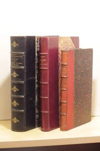 nerfs orné de motifs dorés, tête dorée, [Rel. de l'époque]. Exemplaire du collaborateur, Georges Dottin, avec son exlibris et enrichi d'un portrait de l'auteur et d'un extrait des Annales du Midi rendant compte de l'ouvrage. Coins lég. émoussés— JOINTS :- D'ARBOIS DE JUBAINVILLE (Henry) L'administration des intendants, d'après les archives de l'Aube. Paris, Champion, 1880 ; in-8, demi-veau garance, dos à nerfs orné de filets dorés.tableaux dans le texte. Bon exemplaire.- RIGAULT (Abel). Le procès de Guichard, évêque de Troyes (1308-1313). Paris, A. Picard et fils, 1896 ; in-8,demi-chagrin poli violine à coins, dos à nerfs, tête dorée, non rogné, premier plat de couv. cons.Deux fac-similés hors texte reproduits en phototypie et quelques figures dans le texte. Bon exemplaire, malgré un coin légèrement cogné