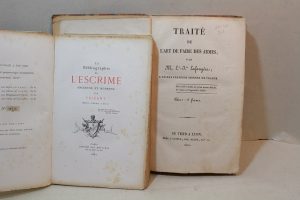 rare. Grande planche gravées sur cuivre, repliée, de figures d'escrime en deux séries. Il semblerait que certains ex. comportent 2 planches, aucune trace d'une seconde dans celui-ci. Vigeant, 78.— JOINT : VIGEANT (Arsène). La Bibliographie de l'escrime ancienne et moderne. Paris, Motteroz, 1882 ; pet. in-8, broché. Édition originale rare. L'un des 420 exemplaires numérotés sur papier vélin. Brochage faible