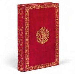 plats, filets, chaînette, petite grecque et roulettes aux palmettes et aux fleurs de lys, armes au centre, dos lisse orné d’un semé de losanges entrelacés et d’un motif à la fleur de lys et aux branchettes de chêne plusieurs fois répété, doublure et gardes de tabis vert d’eau, roulette intérieure dorée, tranches dorées (Susse Papetier de S.A.R. le Duc de Berry). L’ex-libris à la devise « Deus fides fortitudo » présente, sans l’écu, les mêmes attributs héraldiques que celui du poète et bibliophile anglais Thomas Westwood (1814-1888). rousseurs éparses et traces de plis aux deux premiers feuillets. Dimensions : 226 x 139 mm. Provenances : Duchesse de Berry (Cat., Paris, 1837, n°2527 (« 1826 (sic) »), avec son ex-libris « Bibliothèque de rosny » ; ex-libris armorié accompagné de la devise « Deus fides fortitudo ». Exposition : […], Une vie, une collection, Bibliotheca Wittockiana, 10 oct. 2008-28 févr. 2009, éditions Faton, 2008, p. 80, n°65 (notice sur la duchesse de Berry). Brunet, IV, 491 (« édition bien imprimée et fort correcte… [préférable] pour l’usage aux petits édit. des elsevier ») ; Hoefer (J.-c.-F.), Nouvelle Biographie générale, XXXIX, Firmin Didot, 1862, 567-569 ; Fléty (J.), Dictionnaire des relieurs français…, Technorama, 1988, p. 108 ; culot (P.), Jean-Claude Bozerian, un moment de l’ornement dans la reliure en France, p. 26. éDITIoN orIGINaLe. L’œuvre qui fut jouée lors du mariage du duc de Berry. François-adrien Boieldieu (1775-1834) connaît ses premiers succès à Paris pendant la révolution avec des romances et des opéras. en 1803, il part à Saint-Pétersbourg pour être maître de chapelle du tsar alexandre Ier (1777-1825). À son retour en France, il entre à la chambre du roi et donne de nombreux ouvrages lyriques. créée le 5 mars 1816 à l’opéra-comique par les comédiens ordinaires du roi, La Fête au village voisin est jouée sur le théâtre de la cour, le 26 juin 1816, à l’occasion du mariage du duc de Berry avec Marie-caroline de Bourbon-Siciles. en 1825, sera représentée son œuvre la plus fameuse, La Dame blanche. elle est dédiée à la duchesse de Berry, dont il est le compositeur depuis 1821. exemplaire relié à l’époque par Susse aux armes du dédicataire de la partition, le duc de Berry (1778-1820). ces armes, celles de la maison d’artois, ont été portées aussi bien par le comte d’artois (1757-1836), futur charles X, que par ses deux fils, Louis-antoine (1775-1884), duc d’angoulême, et charles-Ferdinand (1778-1820), duc de Berry. L’absence du collier de la Toison d’or et des ancres passées en sautoir (Louis-antoine fut nommé grand amiral de France, en 1814) laisse penser qu’il s’agit ici de l’exemplaire du dédicataire, le duc de Berry. De plus, l’étiquette de Susse, à son adresse, passage des Panoramas, n°7, collée au verso de la première garde, annonce qu’il était « papetier de S.a.r. le Duc de Berry ». en 1816, ce dernier vient d’épouser Marie-caroline de Bourbon-Siciles (1798-1870), avec laquelle il partagera un goût commun pour les arts et l’opéra en particulier. Mors épidermés et coiffes supérieures usées. Dimensions : 339 x 264 mm. Provenances : charles-Ferdinand d’artois, duc de Berry ; ex-libris armorié d’un membre de la famille de chabannes et devise « Non palma sine pulvere ». Exposition : culot (P.), Relieurs et reliures décorées en France aux époques Directoire et Empire, Bibliotheca Wittockiana, 16 sept. 2000-10 févr. 2001, Bruxelles, n°109, avec reproduction. Fétis (F.-J.), Biographie universelle des musiciens, II, Firmin-Didot, 1878, pp. 1-8 ; Tulard (J.), Dictionnaire Napoléon, Fayard, 1989, p. 240 ; […], The New Grove Dictionary of Opera, I, MacMillan, 1997, pp. 523-526 ; […], Entre cour et jardin, Marie-Caroline, duchesse de Berry, Sceaux, 2007, pp. 204 ; ramsden (c.), French Bookbinders, 1789-1848, Lund Humphries, 1950, p. 196.