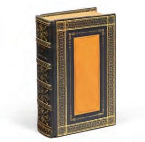 listel de maroquin rouge orné à froid et d’un jeu de filets dorés, dos lisse orné d’un décor mosaïqué rappelant celui des plats, doublure et gardes de papier moiré ivoire imitant le tabis, sertie d’un jeu de filets dorés, tranches dorées (Vogel). Nouvelle édition de la traduction du r. P. Jérôme de Gonnelieu, publiée pour la première fois en 1712. L’Imitation de Jésus-Christ : le plus grand succès éditorial du XVe au XIXe siècle, après la Bible. Formé de quatre traités indépendants, écrits au XVe siècle par Thomas a Kempis (1379-1429), chanoine régulier de la congrégation de Windesheim, ce livre de piété reçut son titre, De Imitatione Christi, de l’incipit du premier chapitre du premier traité. ouvrage majeur de la dévotion moderne destiné à promouvoir l’oraison individuelle, la lecture méditative des écritures, le détachement et le mépris du monde, il connut plus de 4 000 éditions en 90 langues. 5 figures en PreMIer TIraGe, d’après les dessins du peintre Horace Vernet (1789-1863), interprétées à l’eau-forte par Blanchard et Vallot, et gravées sur acier par Pigeot, Leroux et Bovinet. Luxueuse reliure mosaïquée décorée de plaques néo-gothiques, de Vogel. originaire de Dresde, e. Vogel installe un atelier à Paris vers 1814. Ses travaux, qui offrent une grande variété de décors, se distinguent avant tout par l’emploi fréquent de la mosaïque dont il maîtrise autant la technique que les possibilités décoratives, en particulier pour la réalisation des décors néo-gothiques ou « à la cathédrale ». La même plaque dorée sur fond mosaïqué fut utilisée par le praticien pour le décor des plats d’un exemplaire des Œuvres choisies de rousseau qui appartint à la bibliothèque Descamps-Scrive (Cat. II, Paris, 25 mai 1925, n°106). Dimensions : 233 x 146 mm. Exposition : culot (P.), Relieurs et reliures décorées en France à l’époque romantique, Bibliotheca Wittockiana, 7 oct. 1995-20 janv. 1996, Bruxelles, n°59, avec reproduction. carteret, Trésor, III, p. 311 (à la date de 1822) ; De Backer (r.P. a.), Essai bibliographique sur le livre De Imitatione christi, Liège, 1864, p. 68 ; culot (P.), Relieurs et reliures décorées en France à l’époque romantique, Bibliotheca Wittockiana, 1995, p. 571 (notice sur Vogel).