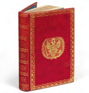 doublure et gardes de tabis crème, sertie d’une roulette dorée, tranches dorées (Rel. P. Lesné 1822). alexandre Ier Pavlovitch monta sur le trône de russie en 1801, après l’assassinat de son père, et entreprit d’importantes réformes qui furent ensuite abandonnées par son successeur. épris de culture française, il fit venir de nombreux artistes à Saint-Pétersbourg, parmi lesquels le compositeur Boïeldieu et l’actrice Mademoiselle Georges, mais il n’en fut pas moins l’un des principaux adversaires de Napoléon. en 1815, lors de l’occupation des troupes de la coalition, il tâcha de tempérer les exigences contre la France et parvint à éviter son dépeçage. La présence de l’étiquette de la bibliothèque du palais de Pavlosvk, où résida, jusqu’à sa mort en 1828, l’impératrice Maria Feodorovna, peut raisonnablement laisser penser qu’il s’agit d’un présent destiné à honorer le souvenir des liens qui avaient été les siens avec la duchesse d’orléans. Zezzio exerça à Paris pendant quelque quarante-cinq années, dès 1797. L’ouvrage porte ici son étiquette à l’adresse de la rue du Foin-Saint-Jacques, n°15. Dimensions : 192 x 120 mm. Provenance : alexandre Ier, tsar de russie, avec ses armes sur les plats et l’étiquette de rangement de la bibliothèque du palais de Pavlovsk. Exposition : culot (P.), Relieurs et reliures décorées en France à l’époque romantique, Bibliotheca Wittockiana, 7 oct. 1995-20 janv. 1996, Bruxelles, n°3, avec reproduction. […], Une vie, une collection, Bibliotheca Wittockiana-éditions Faton, 2008, p. 66 (notice sur la duchesse d’orléans) ; culot (P.), Relieurs et reliures décorées en France à l’époque romantique, Bibliotheca Wittockiana, 1995, p. 574 (notice sur Zezzio). éDITIoN orIGINaLe. « La sibylle du faubourg Saint-Germain. » Nécromancienne et cartomancienne, Marie-anne-adélaïde Le Normand (1772-1843) exerça ses talents à Paris, sous la révolution, l’empire et la restauration. Sa notoriété fut considérable. elle reçut des personnages éminents (tels robespierre ou Marat, auxquels elle prédit des morts violentes, Joséphine de Beauharnais, qui contribua à sa vogue, ou alexandre Ier ; Napoléon, dit-on, manifesta la curiosité de la consulter…) et publia des prophéties, parfois hardies, concernant les événements politiques du temps qui exaspérèrent les pouvoirs successifs et lui valurent à plusieurs reprises la prison. Ses Souvenirs de la Belgique font suite à son arrestation pour espionnage à Bruxelles, en 1821, après qu’elle eut publié La Sibylle au congrès d’Aix-la-Chapelle (1819), congrès au cours duquel les Bourbons demandaient à la coalition d’alléger les sanctions qui pesaient sur la France. elle imputa toujours les attaques qu’elle eut à subir aux vérités qu’elle ne pouvait taire et qui devaient sauver la France. Un portrait de l’auteur en frontispice, lithographié d’après un dessin de champion. exemplaire aux armes du roi Louis XVIII (1755-1824), dans une reliure de Mathurin-Marie Lesné, datée 1822. La tradition veut qu’alors qu’il était comte de Provence, Louis XVIII ait eu recours aux services de Marie-anne-adélaïde Le Normand et qu’une fois devenu roi, il ait demandé à la voir. Par ailleurs, celle-ci « prophétisa » l’assassinat de son neveu, le duc de Berry, en 1820, et la naissance posthume du duc de Bordeaux, héritier du trône de France. en 1824, elle publiera L’Ange protecteur de la France au tombeau de Louis XVIII et, en 1833, Arrêt suprême des dieux de l’Olympe en faveur de Mme la duchesse de Berry et de son fils. au verso du faux-titre, l’ouvrage porte l’inscription à l’encre noire : « hommage respectueux de l’auteur ». Lesné (1777-1841), qui exerça à Paris, de 1804 à 1841, fut l’un des relieurs attitrés de Louis XVIII. on lui doit la première source imprimée importante consacrée à l’art du relieur, La Reliure, poëme didactique en six chants, qu’il publia en 1820. Dimensions : 201 x 124 mm. Provenances : Louis XVIII ; Pajol, avec son ex-libris. Expositions : […], Une vie, une collection, Bibliotheca Wittockiana, 10 oct. 2008-28 févr. 2009, éditions Faton, 2008, p. 68, n°55 (notice sur Louis XVIII, avec reproduction) ; culot (P.), Relieurs et reliures décorées en France à l’époque romantique, Bibliotheca Wittockiana, 7 oct. 1995-20 janv. 1996, Bruxelles, n°16, avec reproduction.. caillet, 6516 ; Dimitriadis (D.), Mademoiselle Lenormand : voyante de Louis XVI à Louis-Philippe, L’Harmattan, 1998, passim ; culot (P.), Relieurs et reliures décorées en France à l’époque romantique, Bibliotheca Wittockiana, 1995, p. 525 (notice sur Lesné).