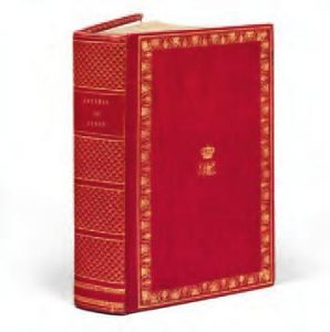 dentelées et aux fleurs de lys et filet dorés, armes couronnées au centre du plat supérieur, monogramme [Sg] surmontant des palmes nouées et couronné d’épines, au centre du plat inférieur, l’ensemble doré, dos lisse orné d’une fleur de lys plusieurs fois répétée, doublure et gardes de tabis vieux rose, roulette intérieure dorée, tranches dorées (reliure de l’époque). ensemble des prières et des lectures de la liturgie catholique prévues pour la fête de sainte Geneviève (423-512), patronne de Paris, célébrée le 3 janvier de chaque année. ont été reliés avec : […]. Bénédiction de l’eau. S. l., s. é., s. d. (48 pp., interfoliées entre le feuillet de titre et les feuillets de texte de l’Office de sainte Geneviève, patronne de Paris…) - […]. L’office du dimanche, pour l’après-midi. S. l., s. é., s. d. (36 pp., précédées d’1 f. bl.) - […]. office de sainte Geneviève du Miracle des ardents…, Paris, Imprimerie de Mad. Jeunehomme-Crémière, 1822 (15 pp.). exemplaire aux armes de Marie-caroline de Bourbon-Siciles (1798-1870), duchesse de Berry. au moment de la reliure, celle-ci a fait apposer par le doreur, sur le plat inférieur, le monogramme [SG], pour sainte Geneviève, accompagné des palmes des martyrs (parfois des saints) et surmonté de la couronne d’épines du christ. Veuve en 1820, après l’assassinat du duc de Berry par Louvel, Marie-caroline, dont la riche bibliothèque abordait les sujets les plus variés, possédait également de très nombreux ouvrages de dévotion. Dimensions : 168 x 95 mm. Provenance : Duchesse de Berry (Cat., Paris, 20 février et jours suiv. 1837, n°36). Exposition : culot (P.), Relieurs et reliures décorées en France à l’époque romantique, Bibliotheca Wittockiana, 7 oct. 1995-20 janv. 1996, Bruxelles, n°2, avec reproduction. […], Une vie, une collection, Bibliotheca Wittockiana-éditions Faton, 2008, p. 80 (notice sur la duchesse de Berry).