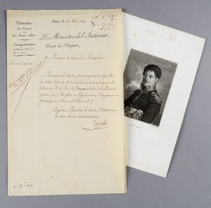 « Monsieur le Comte, je m'empresse de répondre à votre lettre du 11 de ce mois, en vous renvoyant la lettre de M. le Duc de Vicence relative à la planche gravée par Morghen et représentant l'Empereur au passage du Mont St Bernard. Agréez, Monsieur le Comte, l'assurance de ma haute considération».