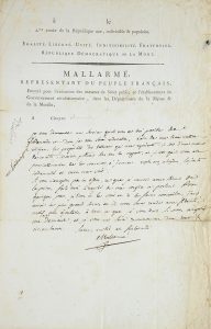 MALLARME René-François (1755-1835). Lettre autographe signée Mallarmé adressée à Monsieur Bonneville (graveur), (sans date), 1 page, in-folio, sur papier à en-tête imprimé Mallarmé, représentant du peuple français [...] dans les...