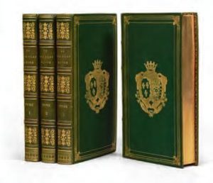 sur l’intérieur d’écoinçons de fers rocaille et arabesques, armes au centre, dos à nerfs orné, doublure et gardes de moire gris pâle, roulette intérieure dorée, tranches dorées (Ch. Petit Relieur Fecit). Seconde édition de ce célèbre ouvrage sur la reliure, l’originale ayant paru en 1820. M.-M. Lesné (1777-1841), relieur de Louis XVIII et auteur de l’une des premières études importantes sur l’art de la reliure. Serrurier, Lesné quitta son métier à 27 ans pour exercer celui de relieur, que, disait-il, il avait appris seul. Il publia ensuite ce célèbre ouvrage, composé d’un poème en six chants, suivi de 135 pages de notes, d’un mémoire technique et de textes divers, dont deux épîtres aux relieurs Joseph Thouvenin (1791-1834) et rené Simier (?-1826). L’auteur le dédia à son fils, son « premier ouvrier » qui exerça à Paris entre 1820 et 1839, date à laquelle il se noya dans la Seine. édition limitée à 125 exemplaires, tous imprimés sur grand raisin vélin et numérotés (n°66). est relié avec, du même auteur : À la gloire immortelle des inventeurs de l’imprimerie par Lesné, relieur français. Paris, Chez l’auteur, s. d. éDITIoN orIGINaLe, rare, de ce très court poème consacré à la gloire de Johannes Gutenberg, Johann Fust et Peter Schoeffer, inventeurs et promoteurs de l’imprimerie. exemplaire de présent, aux armes de France, offert par le relieur charles Petit au comte de chambord (1820-1883). Sur le recto du feuillet blanc qui précède le faux-titre, charles Petit, qui succéda à alphonse Simier en 1847, a rédigé un long envoi autographe signé, par lequel il adresse ce volume relié par ses soins à Henri d’artois, duc de Bordeaux puis comte de chambord, prétendant au trône de France, sous le nom d’Henri V. Il y atteste la ferveur de ses sentiments à l’endroit du comte, non sans lui faire montre de la qualité de son travail : À Son Altesse Royale Monseigneur le Comte de Chambord Hommage / De respecteuex (sic) dévouement, Et de vive reconnaissance d’un De ses plus humbles, mais bien fidèl (sic) serviteur. Charles Petit Relieur-Papetier, Fg St Honoré 115 L’un des trois délégués, des soixantes (sic) Parisiens, qui ont eu l’honneur d’être Admis, à présenter leurs hommages Respecteuex (sic), à Son altesse Royale, Monseigneur le Comte de Chambord A Wiesbaden, en aout (sic) 1850. Paris Fin septembre 1851. Fils de la duchesse de Berry, laquelle fut l’une des femmes bibliophiles les plus raffinées du XIXe siècle, le comte de chambord posséda lui aussi une importante bibliothèque, constituée d’ouvrages choisis, soigneusement reliés aux armes d’artois ou à celles de France. L’ouvrage passa ensuite entre les mains de Jaime de Borbón y Borbón-Parma (1870-1931), dit aussi Jacques de Bourbon, duc de Madrid. Prince de la branche espagnole des Bourbons, devenue branche aînée après la mort de chambord, il fut prétendant légitimiste au trône de France sous le nom de Jacques Ier, tandis qu’il l’était, sous le nom de Jacques III, à celui d’espagne. en 1909, il s’installa au château de Froshdorf, en autriche, qui avait été auparavant la résidence du comte de chambord, jusqu’à sa mort en 1883. Mouillure claire dans la marge supérieure du volume. Mors épidermés. Dimensions : 223 x 143 mm. Provenances : Henri V ; don Jaime de Bourbon, avec son timbre humide ; Bernard Breslauer (Cat., Paris, 1995, n°4). Expositions : […], Une vie, une collection, Bibliotheca Wittockiana, 10 oct. 2008-28 févr. 2009, éditions Faton, 2008, p. 86, n°71 (notice sur le comte de chambord, avec reproduction) ; culot (P.), Relieurs et reliures décorées en France à l’époque romantique, Bibliotheca Wittockiana, 7 oct. 1995-20 janv. 1996, Bruxelles, n°144, avec reproduction. Devauchelle (r.), La Reliure en France…, II, rousseau-Girard, 1960, p. 243 ; H. Béraldi, La Reliure du XIXe siècle, II, p.74, n°75 (pour un exemplaire relié par Debes) ; culot (P.), Relieurs et reliures décorées en France à l’époque romantique, Bibliotheca Wittockiana, 1995, pp. 538 (notice sur charles Petit).