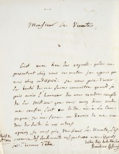 « Monsieur Le Vicomte, c'est avec bien des regrets qu'en me présentant chez vous ce matin j'ai appris que vous étiez indisposé. Je vous prie d'avoir la bonté de me faire connaître quand je puis avoir l'honneur de vous rendre compte de La Mission que vous avez bien voulu me confier ; soit en ville où à La Campagne, je me ferai un devoir de me rendre de suite à vos ordres. Agréez, je vous prie, Monsieur Le Vicomte, l'assurance des sentiments respectueux avec lesquels j'ai l'honneur d'être. Votre très humble serviteur Gioacchino Rossini ».