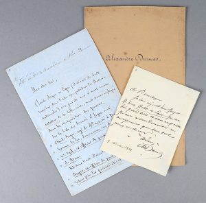 « Cher Beauchesne, je suis aujourd'hui jusqu'à 4 heures à l'Hôtel de Paris, j'ai un bien grand désir de vous embrasser. J'ai aussi à vous demander un renseignement que vous seul pouvez me donner, à vous Alex Dumas » « Mon cher ami, Claude Auger ou Oger (il est écrit de deux manières dans l'acte que possèdent les Archives Nationale) n'a pas été mis à mort comme assassin de sa belle-mère, mais comme impliqué dans la conspiration des prisons sur la liste des accusés il figure ainsi : Claude Auger, âgé de 45 ans, né à Paris, homme de loi, demeurant rue de l'Egalité, n°294, ex officier de paix de la commune à Paris. » (.) « Bonjour cher ami. Je puis dire que vous avez été servi aux archives selon votre droit, c'est à dire avec plus d'activité que ne l'eut été aucun roi de la terre. A vous. A. de Beauchesne », « L'avis que je vous donne (à la hâte sachant combien vous êtes pressé !) est tout confidentiel : vous recevrez sans doute ce renseignement officiellement de notre . si vous voulez voir ce .il est à votre disposition mais il ne contient rien de plus que ce que j'y ai copié fidèlement. La condamnation à mort est signée par les citoyens Pierre André ., vice président ; Etienne Foucault et Philippe Jean Marie . juges du tribunal révolutionnaire. Elle a la date du 8 thermidor an II (= 26 juillet 1794) et porte que l'exécution aura lieu dans les 24 heures. Les dates qu'on vous avait . n'étaient donc pas exactes ».