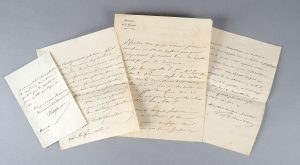 pages, in-8° et in-folio. Lettres portées avec nom manuscrit du destinataire au dos du document et traces de cachet en cire rouge. Pliures et petites déchirures, mais bon état général.