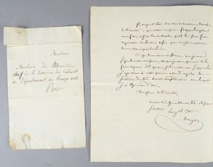 au Vicomte Sosthène de la Rochefoucauld, Paris, le 10 avril 1825, 1 page ^, infolio ». Porte en lettres rouges d'une autre main la date à laquelle cette demande fut faite au roi : le 19 avril 1829, avec le n°2487 et l'inscription : « Victor Hugo demande de décoration. »