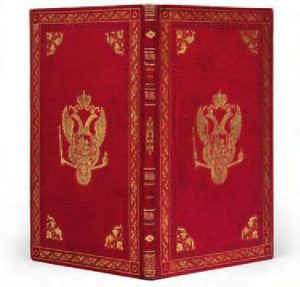rouge, autour des plats, jeu de filets dorés, roulette dorée aux palmettes à fond criblé et fleurs de lys, filet à froid et roulette à froid, armes au centre, surmontées, sur le premier plats de l’inscription frappée à l’or « à charles X / le Bon Père de Famille / ami Vrai de l’Humanité », dos lisse orné et muet, doublure et gardes de tabis rouge, roulette intérieure dorée, tranches dorées (Duplanil Fils, Relieur de Son Altsse Royle Madame La Dauphine). Louis Germain vint exercer à Paris vers 1829, après avoir été actif au Mans. Il adjoignit à son nom celui du relieur alphonse Simier, dont il avait épousé une parente. Le volume porte son étiquette à l’adresse rue des Bons-enfants, n°34. Dans une lettre du 23 avril 1829, adressée à l’intendant général de la Maison du roi, afin de solliciter l’approbation royale, Germain écrit qu’il été choisi « par Mr de Milly pour relier tous les volumes dont [celui-ci] a fait hommage à toute la famille royale, à tous les empereurs et rois des quatre parties du monde… ». Dimensions : 230 x 126 mm. Provenance : Nicolas Ier, tsar de toutes les russies. Exposition : culot (P.), Relieurs et reliures décorées en France à l’époque romantique, Bibliotheca Wittockiana, 7 oct. 1995-20 janv. 1996, Bruxelles, n°11, avec reproduction. Detape (a.), « recherches sur la famille de Louis-adolphe de Milly », dans Généalogie... de la Caraïbe, n°34, janv. 1992, p. 484 ; culot (P.), Relieurs et reliures décorées en France à l’époque romantique, Bibliotheca Wittockiana, 1995, pp. 508-509. éDITIoN orIGINaLe. Un monument national pour développer l’industrie française. L’auteur, afin de favoriser les échanges commerciaux, propose la création d’un établissement où seraient exposés les produits de l’industrie nationale.Souhaitant,en outre,donner une dimension sociale à son institution,il offre d’y venir aussi en aide aux citoyens les plus démunis. Une longue partie est consacrée au moyen de pourvoir au financement du projet et de son fonctionnement.