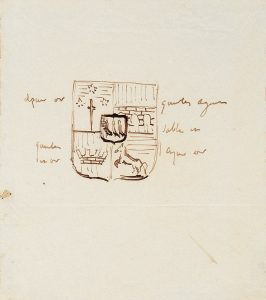 HUGO Victor (1802-1885). Dessin à l'encre brune fait par l'auteur, représentant un projet pour son blason, collé sur une feuille cartonnée, portant au bas du document l'inscription manuscrite de la main du Vicomte Alcide de Beauchesne, avec son...
