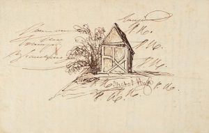 HUGO Victor (1802-1885). Dessin à l'encre brune fait par l'auteur, représentant une petite maison en bois, entouré d'une dédicace et signé Victor Hugo, au dos figure l'inscription manuscrite de la main du Vicomte Alcide de Beauchesne : « Dessin...