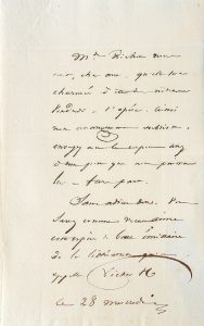 « Mademoiselle Pichon nous écrit, cher ami, qu'elle sera charmée d'être des nôtres vendredi à l'Opéra. Ainsi mon arrangement subsiste, envoyez moi le coupon assez à temps pour que je puisse lui en faire part. Sans adieu donc. Vous savez comme vous aime cette espèce de bouc émissaire de la littérature qu'on appelle Victor Hugo ».