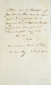« Adieu, mon cher Beauchesne. Je pars vers une heure avec un ami. Si je ne vous voyais pas d'ici là, voulez-vous dire à M. de la Rochefoucauld que je me suis présumé pour avoir l'honneur de prendre congé à lui ? Tout à vous ... à bientôt à Paris ».