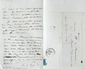 HUGO Victor (1802-1885). Lettre autographe signée Votre V. Hugo, adressée au Vicomte Alcide de Beauchesne (1804-1873), le 18 mai 1830, 2 pages, in-8°, avec adresse manuscrite du destinataire au dos du document, cachet de poste. Petite déchirures,...