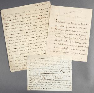 BEAUCHESNE Alcide, Vicomte de (1804-1873).Ensemble de trois brouillons de lettres adressées à Alphonse de Lamartine (1790-1869), datées du 29 juillet 1830, du 2 juillet 1835, et sans date, 5 pages ^, in-4° et in-folio. On y joint un lot...