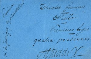 VIGNY Alfred de (1797-1863). Invitation manuscrite signée Alfred de Vigny, pour quatre personnes, envoyée au Vicomte Alcide de Beauchesne à l'occasion de la première représentation de la pièce d'Othello (joué le 24 octobre 1829) donnée au...